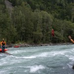 Eine Möglichkeit Zeit zu gewinnen ist es passende Handlungsoptionen zu kennen und trainiert zu haben. Dazu hat uns Neil Newton Taylor von Swiftwater Rescue auf der unteren Isel einige Aufgaben gestellt, Lösungsansätze vorgestellt und uns diese dann durchspielen lassen. Ausgegangen wurde von einem Klemmunfall, d.h. ein Paddler hat sich mit seinem Boot so verkeilt, dass er alleine nicht mehr in der Lage ist sich zu befreien.