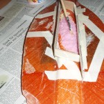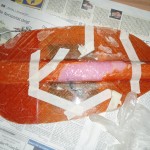 Der Schaden stellte sich nach intensiver Begutachtung als doch enorm heraus, trotzdem wird der Versuch einer Reparatur mit dem Ziel ein Ersatzpaddel zu erhalten in Angriff genommen. Nach einigem Überlegen haben wir uns entschieden zuerst mit der weniger kaputten Seite zu beginnen um wenigstens wieder etwas Stabilität zu erhalten also Lack und lose Teilchen abschleifen, Harz anrühren und drauf mit dem passenden Carbonstück. Nach einiger Trockenzeit habe ich die andere Seite vor mir. Der herausgebrochene Steg aus hartem Schaumstoff wird mit einem Gemisch aus Harz und geheimem Staub aufgefüllt. Zu beachten ist vor allem die überaus schöne rosa Farbe, die nach einiger Trockenzeit leider noch unter einer weiteren Carbon- oder Glasfasermatte verschwinden wird.
