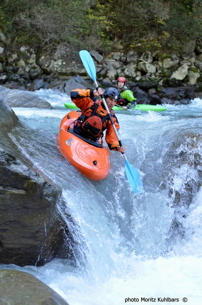 zu treffen. Nach kurzem Einpaddeln kommt hier die erste Stelle, die schräge Platte, ein Fall von 1,5 – 2m in einen kleinen Pool. Die Ausfahrt von dort hat sich dann als einfacher als bei der Besichtigung gedacht herausgestellt. Danach geht es so dahin, das Gefälle ist fast immer zu spüren und bei größerer Wasserwucht verändert sich der Charakter dieses Abschnitts wohl extrem! Kurz vor einer Straßenbrücke haben wir uns dann die zweite Stelle angeschaut. Eine kleine Rutsche bei der es leider einen kleinen Schwimmer gab. Zum Glück konnte er sich schnell selbst retten und auch das Material war nach einem clevern Einsatz geborgen. Danach gings die Hühnerleiter hinunter und die hätte mich fast voll erwischt. Es geht über einige Stufen und Rutschen mit gutem Gefälle nach unten, eine davon hat mich gedreht und nach einigen Einschlagen im Helm konnte ich hochrollen und nach einem kleinen Abfall ins Kehrwasser hüpfen. Die Highlights sind auf der mittleren Ötz immerwieder durch lockerere Stücke verbunden auf den doch immer auch Gefälle vorhanden ist. Kurz vor dem Ende hätten wir das Kehrwasser vor dem neuen 3m Wasserfall fast übersehen. Wir haben noch beraten, da sind schon 3 andere Paddler gekommen und einfach runter, danach war die Linie klar. Ein geiler, fairer Wasserfall und der auch klappt wenn man den Boof verkackt ;-) Der Riot und der Mystic haben eben ein gutes Auftauchverhalten. Schnell noch einen blitzsauberen Boof fotografiert und direkt am Ausstieg an der Brücke zu Köfels noch einen Autoboof mitgenommen, da war die Fahrt auch schon wieder vorbei.