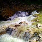 Am Einstieg laufen wir erst mal die Kaiserklamm hoch. So aus 20 Meter Höhe vom Triftsteig sieht eigentlich alles ganz gut fahrbar aus. Als wir etwas später die Schlucht von unten hoch paddeln, spürt man aber bereits in diesem ruhigen Abschnitt die Kraft des Wassers und vom Boot aus gesehen sind die Stufen und das Gefälle plötzlich doch minimal größer und steiler. Naja. Vielleicht das nächste Mal…