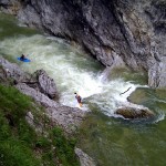 Wir geben Steffi die uns mit der Kamera auf dem Steig begleitet keine Verschnaufpause und stürzen uns gleich weiter in das ‚S‘ und die folgenden Stellen, bis wir kurz vor der Ausgansstufe das letzte Kehrwasser nehmen. Nochmal kurz durchatmen, anständig am Paddel ziehen und wir sind alle durch. Meine Anspannung weicht einer glücklichen Entspannung, während wir uns Flussabwärts Richtung Ausstieg treiben lassen.