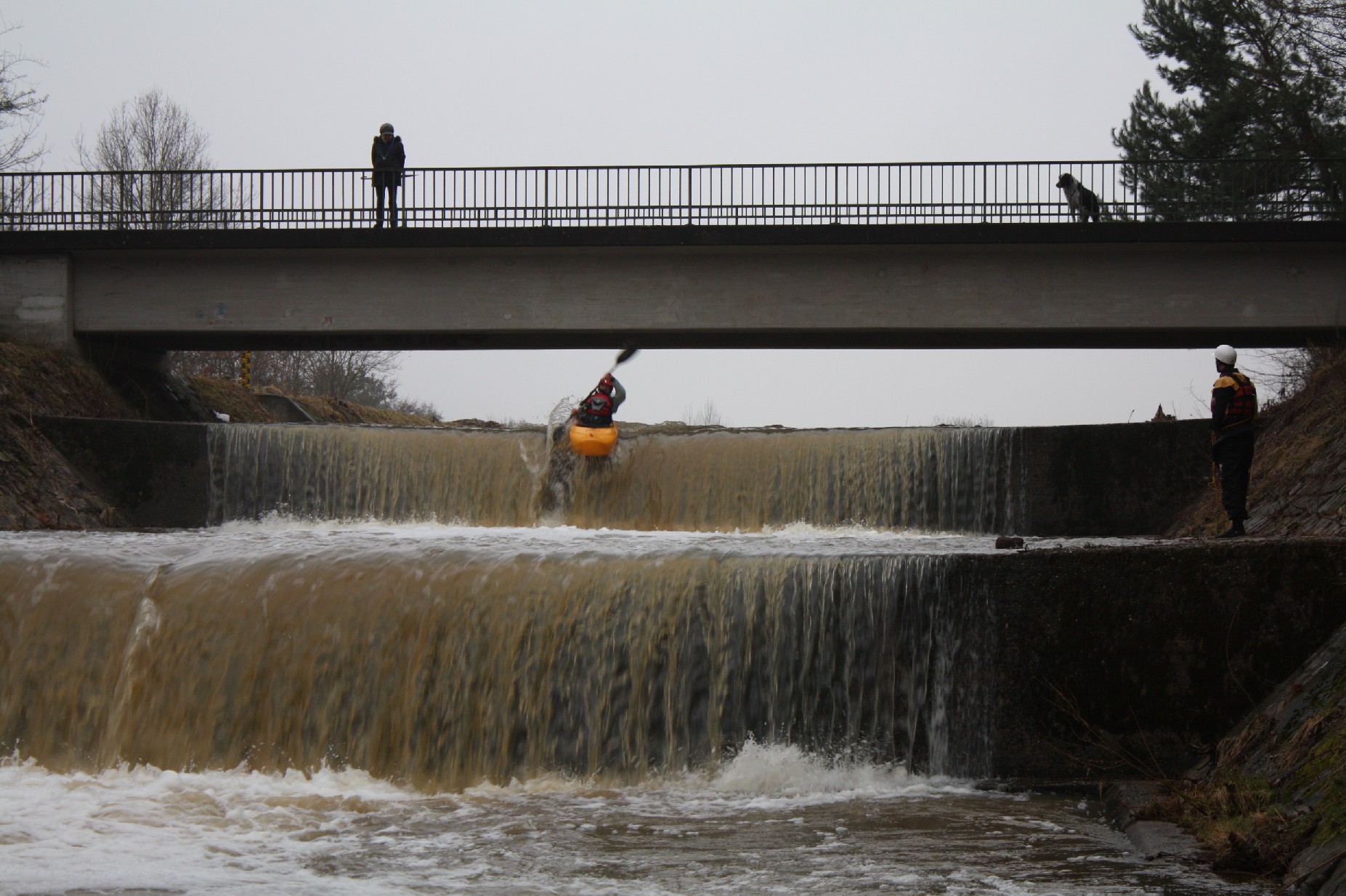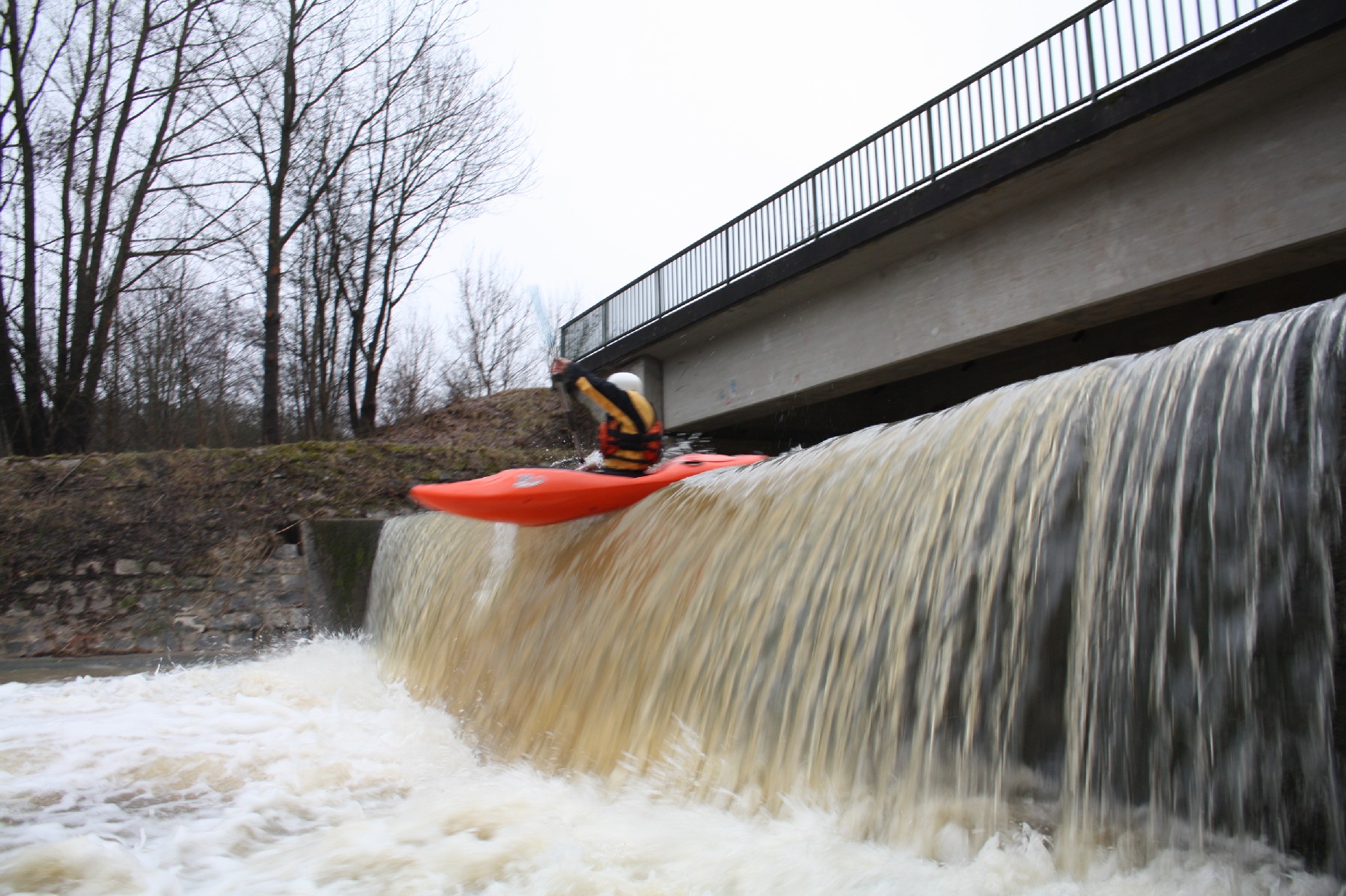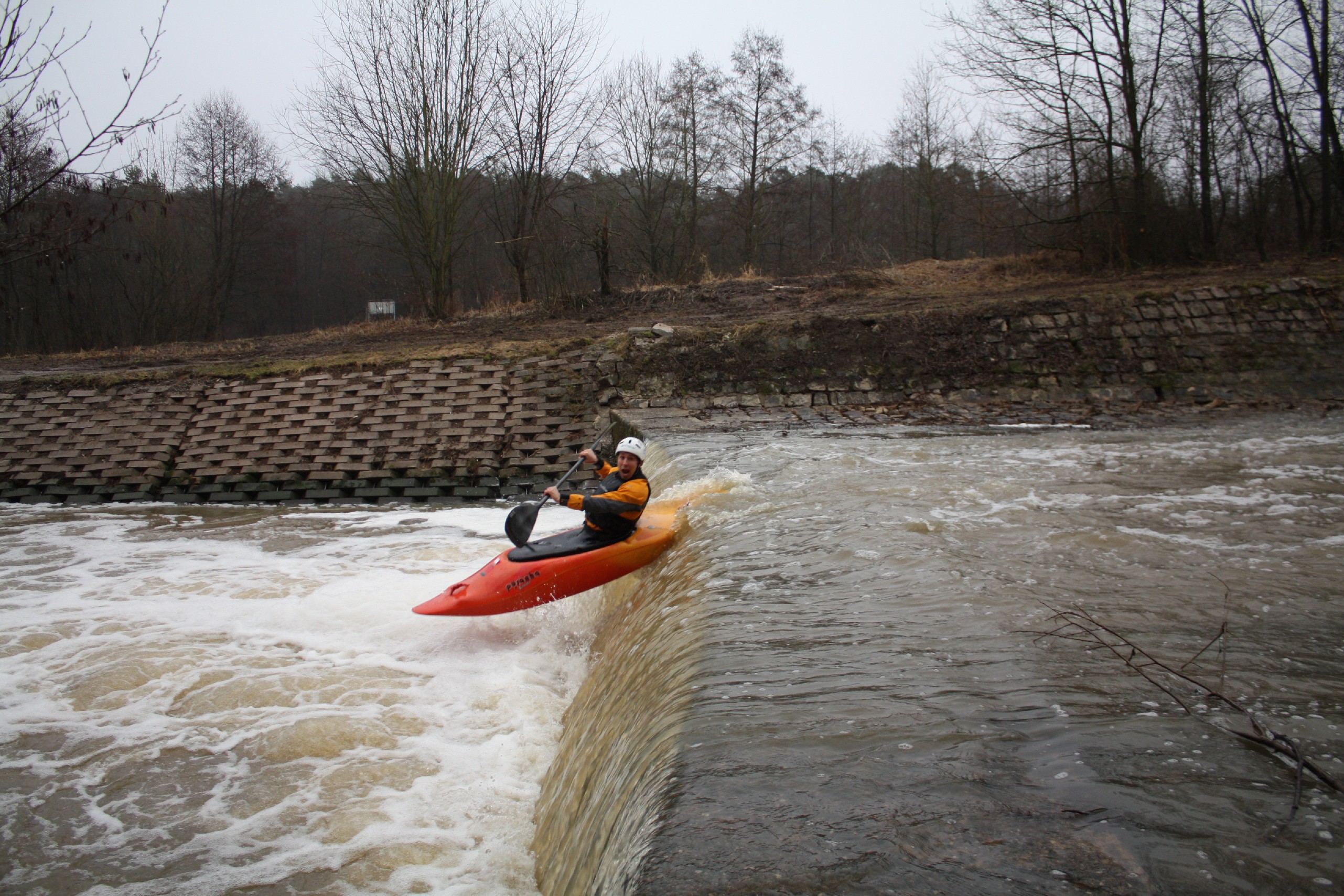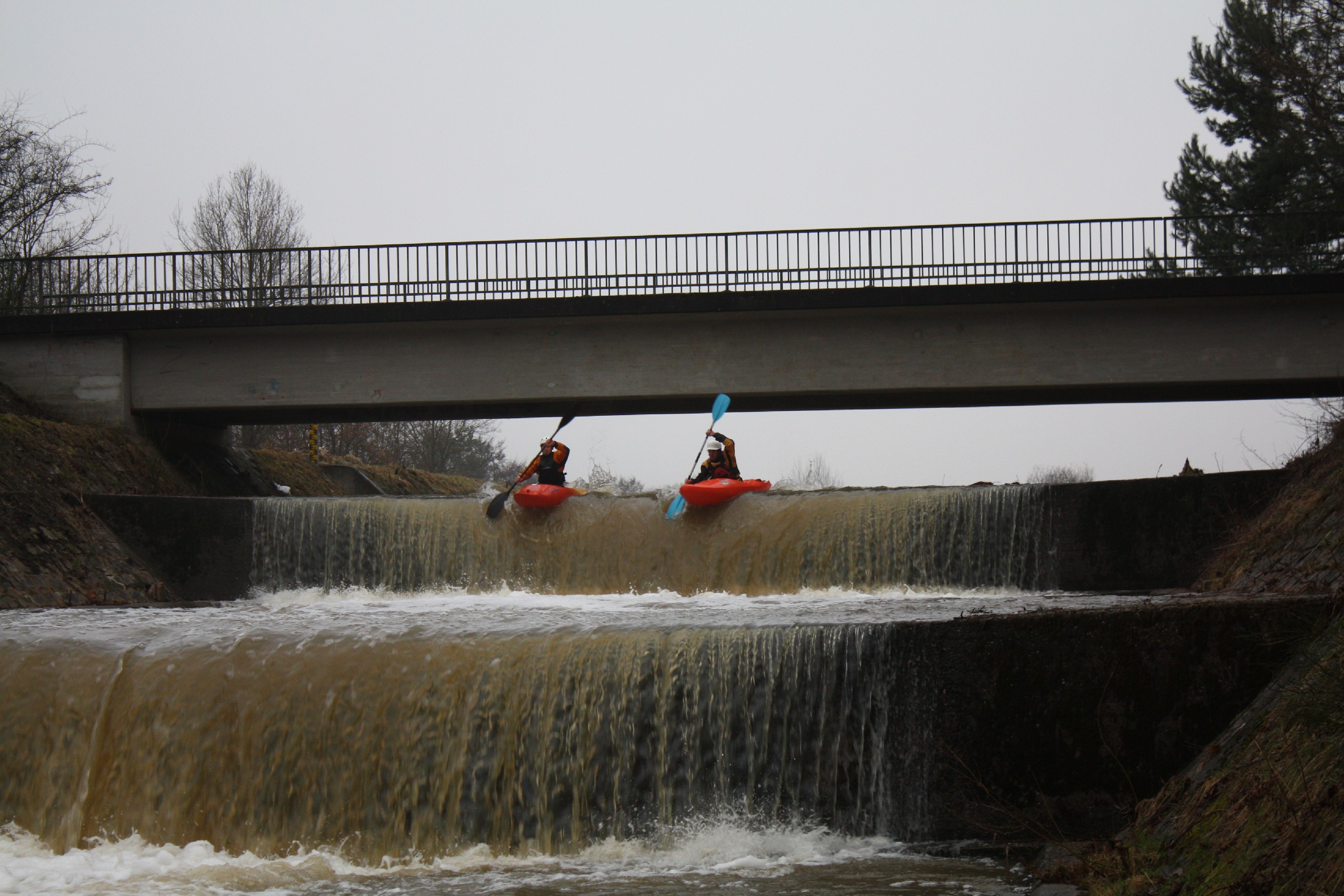 Erlangen 4-5°C und leider keine Sonne. Eingestellt auf eine Runde Ausdauerbolzen auf Flachwasser am Bootshaus haben wir zufällig einige Slalomfahrer mit der gleichen Planung getroffen. Aber dann hatte Andi die Idee einen kleinen „Stufenbach“ in der Nähe zu testen. Olly war natürlich sofort dabei, konnten wir dafür doch die Ausdauereinheit bleiben lassen;-) und auch ich konnte mich so vorm Streckenpaddeln drücken. Bei Normalwasser keine Option, doch beim heutigen Stand gings schon.