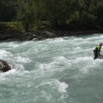 Kurz nach dem Einbooten der etwa 20 Paddler und Paddlerinnen bei Huben war auch schon die erste Übungsstelle erreicht. Aufgabe war es nun einen Fels im Fluss zu Fuß und mit dem Boot zu erreichen. Während das erreichen zu Fuß, per Wurfsack durch den Partner abgesichert, trotz der starken Strömung noch relativ flott von statten ging, sah es beim Erreichen per Boot schon anders aus.