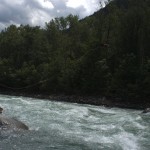 Hatte man das Kehrwasser hinter dem Felsen in Fluss Mitte erwischt, musste man sich mit der Hand die das Paddel hielt am Felsen festhalten, die Spritzdecke Aufreißen, im Boot aufstehen und sich selbst und sein Boot irgendwie auf den Felsen befördern. In dem unruhigen Kehrwasser und mit dem nassen Fels auch ohne echten Zeitdruck nicht ganz einfach.