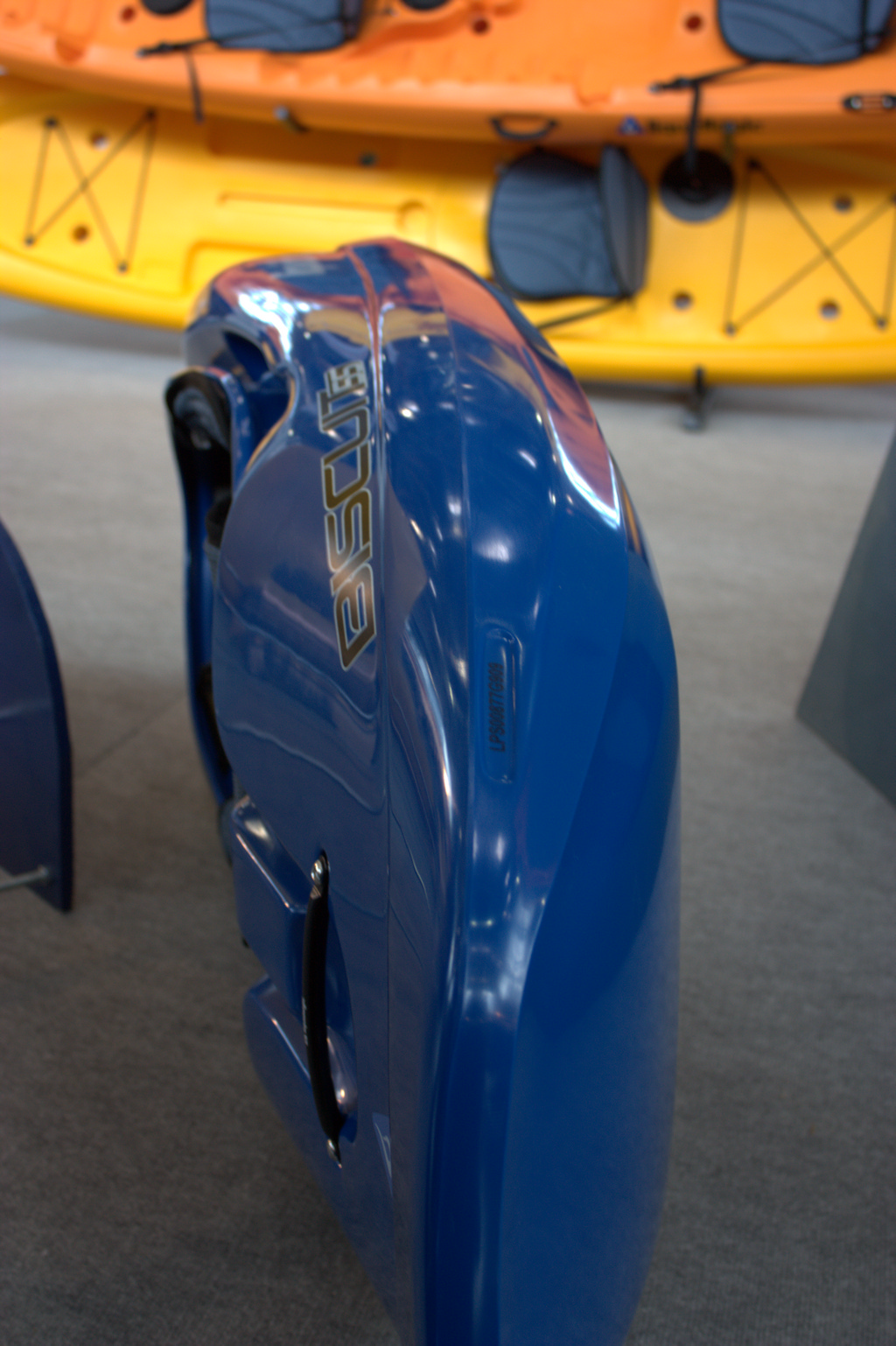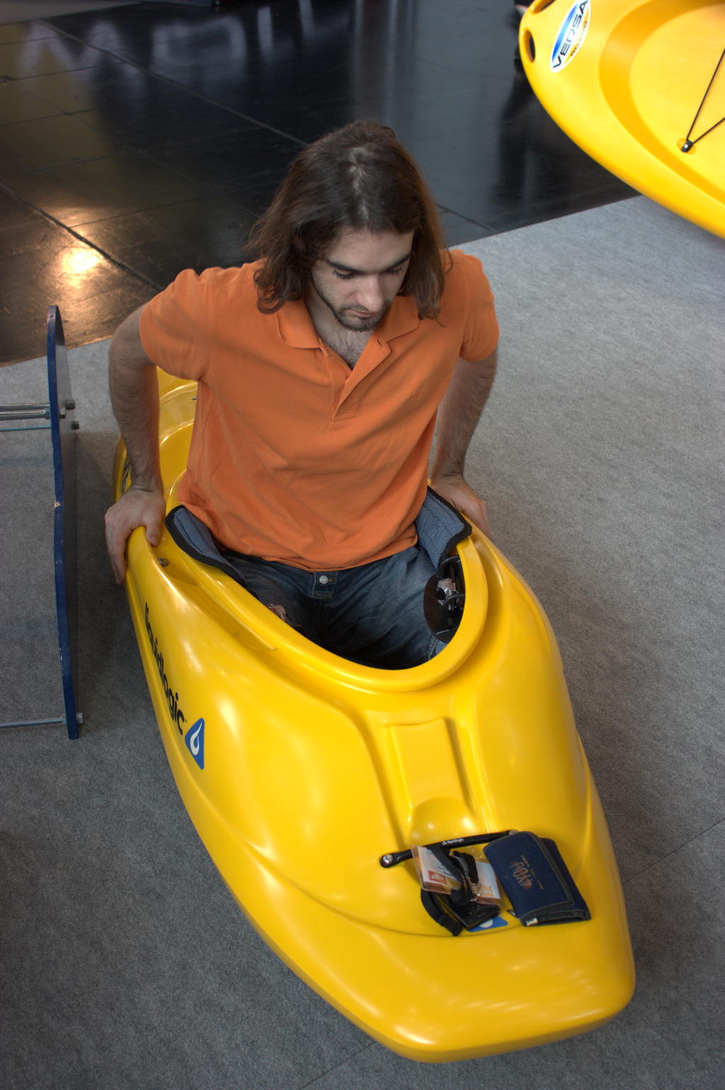 Der Australier Anthony Yap will bis nächsten Frühjahr seine Titan Kayaks an den Mann bringen. Jede Menge Aufkleber von den Pappboot-Fetischisten, aber sonst ne fette Panzeroptik.