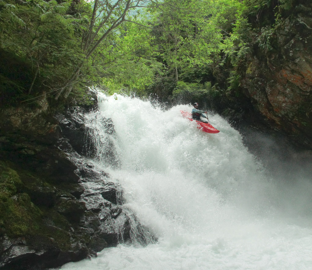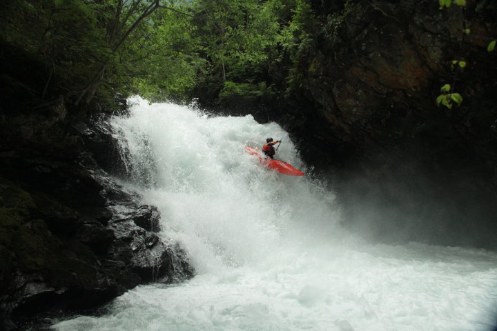 „Runter kommen sie alle!“ Am kleinen Stein rechts vorbei, beim in der Luft hängenden Ast ganz nah ans linke Ufer, mit einem rechten Boof über die kleine Walze auf die linke Seite und Fluuuuuuug, einfach geil! Treffpunkt Kehrwasser.