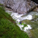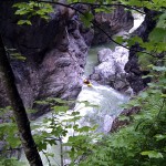 Wir geben Steffi die uns mit der Kamera auf dem Steig begleitet keine Verschnaufpause und stürzen uns gleich weiter in das ‚S‘ und die folgenden Stellen, bis wir kurz vor der Ausgansstufe das letzte Kehrwasser nehmen. Nochmal kurz durchatmen, anständig am Paddel ziehen und wir sind alle durch. Meine Anspannung weicht einer glücklichen Entspannung, während wir uns Flussabwärts Richtung Ausstieg treiben lassen.