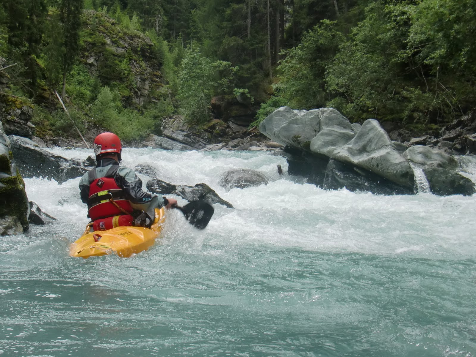 Wenige hundert Meter weiter wartet mit dem Himmelskucker bereits die nächste bekannte Stelle der Ardezer. Ein etwa zwei Meter hoher, rückläufiger Abfall, der sich aber problemlos über eine kleine Steinrutsche boofen lässt. Direkt daran schließt sich noch eine etwas unangenehme Stelle an, die wir über einen kleinen Abfall auf der rechten Seite etwas entschärfen können. Mit dem Wissen, die größten Schwierigkeiten jetzt hinter uns zu haben, spielen wir uns die restlichen Stellen bis zum Ende der Schlucht hinunter. Hier wird die Gruppe wieder neu gemischt und es geht auf der leichteren Scuoler Strecke ohne weitere Vorkommnisse weiter.