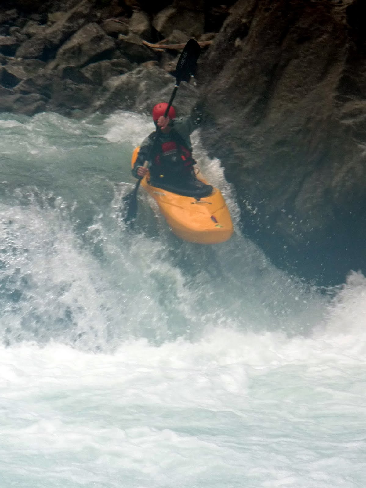 Am Ausstieg der Giarsun stößt noch eine Nachzüglerin hinzu und es geht zu sechst und für mich zum ersten mal in die Ardezer Schlucht. Bis zur Eingangsstufe der Bobbahn die den schweren Teil der Strecke markiert, geht es bei diesem Pegel ähnlich der Stellen der Giarsun dahin. Ich werfe einen Blick auf die Stufe, bzw. den brodelnden Rücklauf darunter, sowie die sich anschließende Strecke die es bei einem Schwimmer zu bewältigen gälte und komme zu dem Schluss lieber den Umtragepfad näher kennen lernen zu wollen. Zwei meiner Mitfahrer gönnen sich jedoch die Stufe und einer von den beiden befährt auch noch die ‚Chicken Line‘ links des Bockschlitzes.